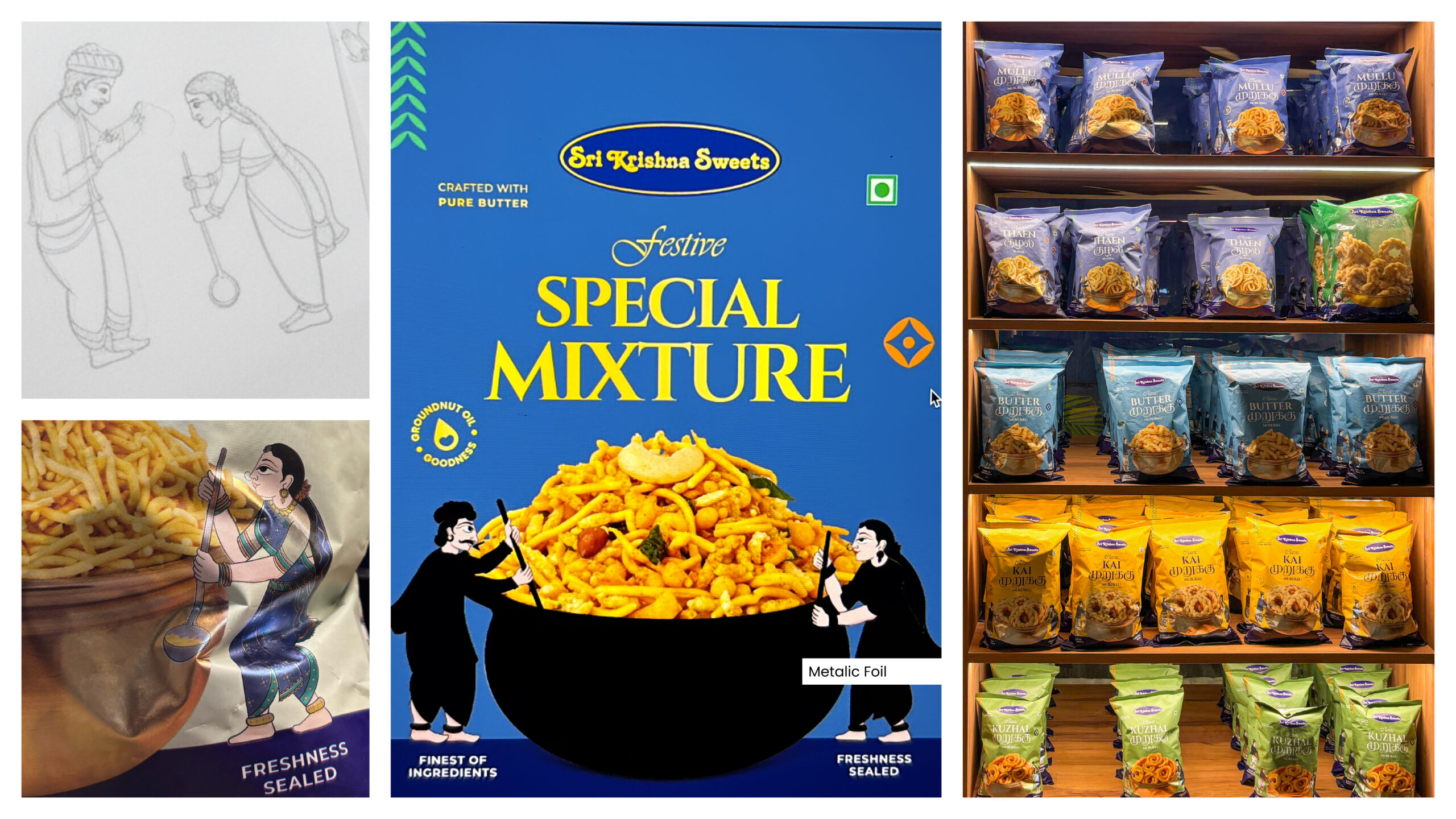 A packaging family with stronger recall, shelf interaction, and clearer ownership. In a cluttered market, it helps people instantly recognise the original Sri Krishna Sweets.