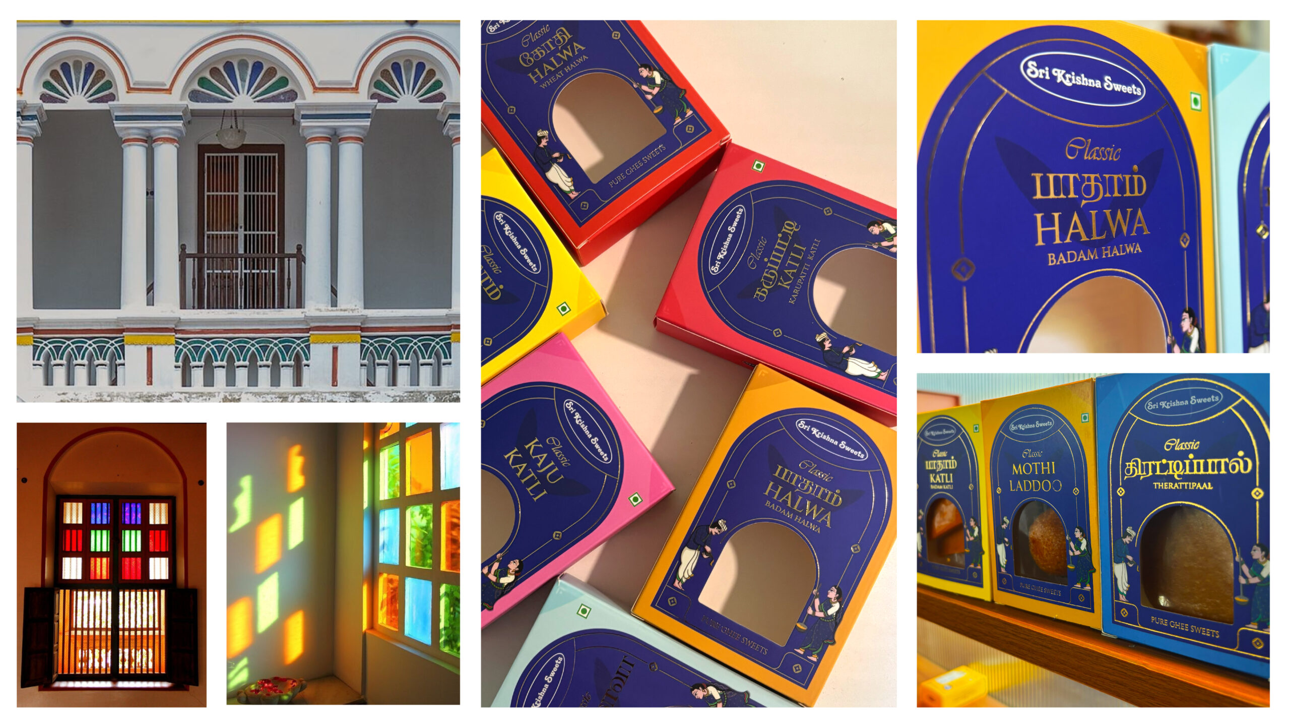 A signature arched window for sweet packs — inspired by heritage architecture, built for recognition, and used as a neat product-view window where needed.